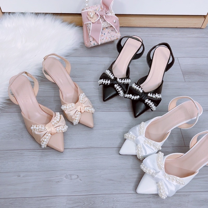 Giày sandal nữ cao gót mũi nhọn nơ lụa bóng viền ngọc gót nhọn 6cm