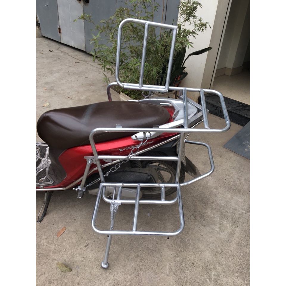 Giá để hàng, baga xe máy đa năng có thể mở cốp đổ xăng không cần tháo. Thiết kế thêm 2 cánh sườn kèm chân chống - Sản phẩm được chế tạo bằng thép hộp mạ đảm bảo độ chắc chắn nhưng vẫn nhẹ nhàng được sơn 1 lớp sơn chống rỉ và trang trí - Sản phẩm khi lắp vào xe đảm b