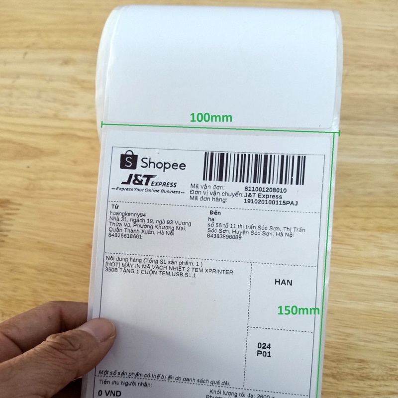 Sản phẩm Tem nhiệt in Shopee, vận đơn TMĐT, đơn hàng, in phiếu giao hàng khổ 100x150mm (Ngang: 100mm - Dọc 150mm), chuyên dùng để in tem dán, tem nhãn, in vận đơn, phiếu giao hàng TMĐT, in đơn hàng shopee. Sản phẩm có độ trắng cao, trên 85 ISO, tích hợp keo dán sẵn, chỉ việc in và bóc ra dán lên sản phẩm, vỏ hộp, vỏ thùng, dán lên kiện hàng TMĐT, đơn hàng shopee... Tem 100x150mm sử dụng được với các loại máy in mã vạch 3 tem nhiệt như Xprinter XP-460B, XP-470B, các máy in mã vạch chuyển nhiệt như Godex G500, TSC TE-200... hoặc có thể cắt rời từng tem, xếp thành tệp và sử dụng được luôn với các máy in A4, A5 thông thường như Canon, Brother, Epson... Giúp tiết kiệm chi phí và công sức in tem nhãn, in vận đơn TMĐT, in đơn hàng shopee cho các chủ shop kinh doanh online với số lượng đơn hàng ngày lớn. Sản phẩm tem nhiệt 100x150mm có các loại: CUỘN 200 TEM/350 TEM/500 TEM. Quý khách hàng và các Quý chủ shop có thể lựa chọn quy cách cuộn tùy vào loại máy và nhu cầu in tem dán, in vận đơn, in đơn hàng hàng ngày của mình.
