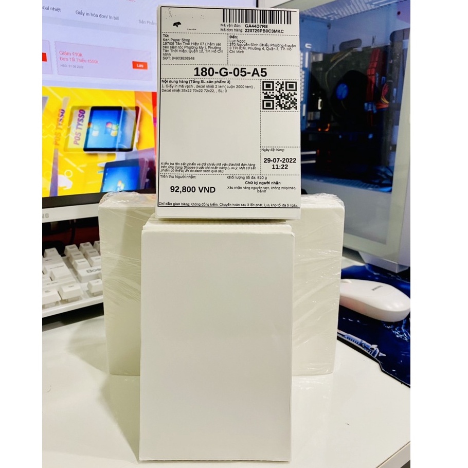 KENPAPER SHOP xin kính chào các anh chị chủ SHOP KENPAPER xin giới thiệu thông số sản phẩm + Thông Số Sản Phẩm Giấy In Nhiệt 100x150 - Decal nhiệt khổ A6 dạng tệp - Kích thước: ngang 100mm x cao 150 mm - Số lượng: 500 tờ / Tệp - Quy cách đóng gói: dạng Tệp có màng bọc nilon bảo quản - Chất liệu: giấy in nhiệt 3 lớp chống thấm có sẵn lắp dán, chống bám bụi giúp đầu in hoạt động trơn tru. - Phương thức in: In nhiệt trực tiếp không cần đổ mực, thông tin được hiển thị rõ nét - Máy in áp dụng: Các dòng máy in nhiệt trực tiếp như HPRT, Gprinter, Godex, Xprinter .. khổ in rộng 105mm. - Kênh in: chuẩn kết nối in ấn từ sàn Shopee và các sàn TMĐT, in từ các kênh vận chuyển như GHTK, J&T, GHN, Viettel, Bưu Điện hay các phần mềm như Nhanhvn, Kiot Việt, Sapo, Haravan, .... + Ưu điểm của sản phẩm Decal nhiệt A6 Dạng Tệp Sản phẩm có độ trắng cao, trên 85 ISO, tích hợp keo dán sẵn, chỉ việc in xong và bóc ra dán lên sản phẩm, vỏ hộp, vỏ thùng, dán lên kiện hàng TMĐT mà không cần mất công dán đè hay làm thêm thao tác gì khác. Sản phẩm tem nhiệt in đơn hàng, vận đơn khổ 100x150mm sử dụng cho các loại máy in mã vạch 3 tem nhiệt như Xprinter XP-460B, XP-470B, DT108B , XP DT426B , XP 420B và các máy in khổ 105mm Tem dạng cuộn treo, có thể in hàng loạt đơn hàng một lúc, giúp tiết kiệm đáng kể chi phí và công sức in tem nhãn, in vận đơn TMĐT, in đơn hàng cho các chủ shop kinh doanh online có số lượng đơn hàng ngày lớn. Lưu ý: Các dòng máy in văn phòng truyền thống như Canon LBP, Brother, HP. Các shop chú ý đây là các máy in văn phòng đổ mực dùng giấy a4, phương thức in khác hoàn toàn với máy in nhiệt. => Mọi vấn đề về chất lượng sản phẩm xin vui lòng liên hệ Shop để được giải quyết và hỗ trợ . Shop cám ơn anh chị đã tin tưởng ủng hộ và sử dụng sản phẩm KENPAPER SHOP . #giayinnhiet #decaltemnhiet #100x150 #indonhang #bangdinh #tuigoihang #75x100 #indonshopee #temvandon #giấy_in_nhiệt #giayinnhieta6 #giayinnhieta7 #tem_nhiệt #in_đơn_hàng #in_đơn_shopee #tem_vận_đơn #giấy_in_nhiệt_a6 #giấy_in_nhiệt_a7