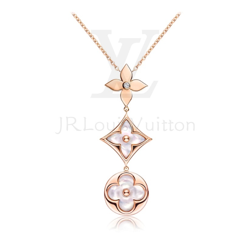 Hoa màu kỷ niệm hoa Monogram, được tạo ra vào năm 1896 bởi Georges-Louis Vuitton. Đặt thành vàng hồng, những bông hoa nở thành một bà mẹ da trắng chạm khắc của ngọc trai. Hàng tháng làm việc là cần thiết để hoàn thiện những đường cong tinh tế và lấp lánh của viên đá. Một loạt các sáng tạo trang sức rực rỡ là một lời mời để tạo ra sự hài hòa cá nhân của riêng bạn. Các tính năng chi tiết Vàng hồng (18kt), ngọc trai trắng và kim cương 1 viên kim cương FG-VVS 0,02 ct Chiều dài: 41 cm với liên kết có thể điều chỉnh ở 39 cm
