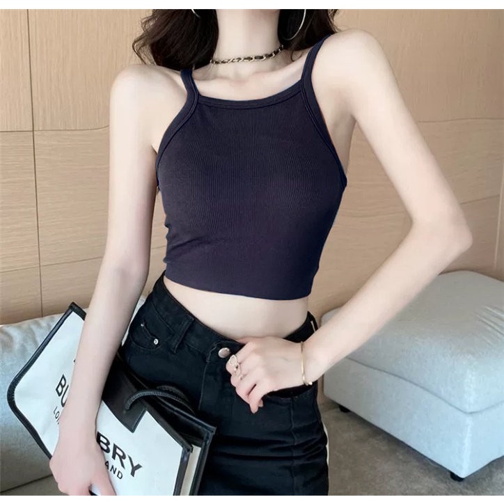 Hỏa Tốc HCM Áo hai dây croptop có mút cổ yếm thun gân màu trơn BS51