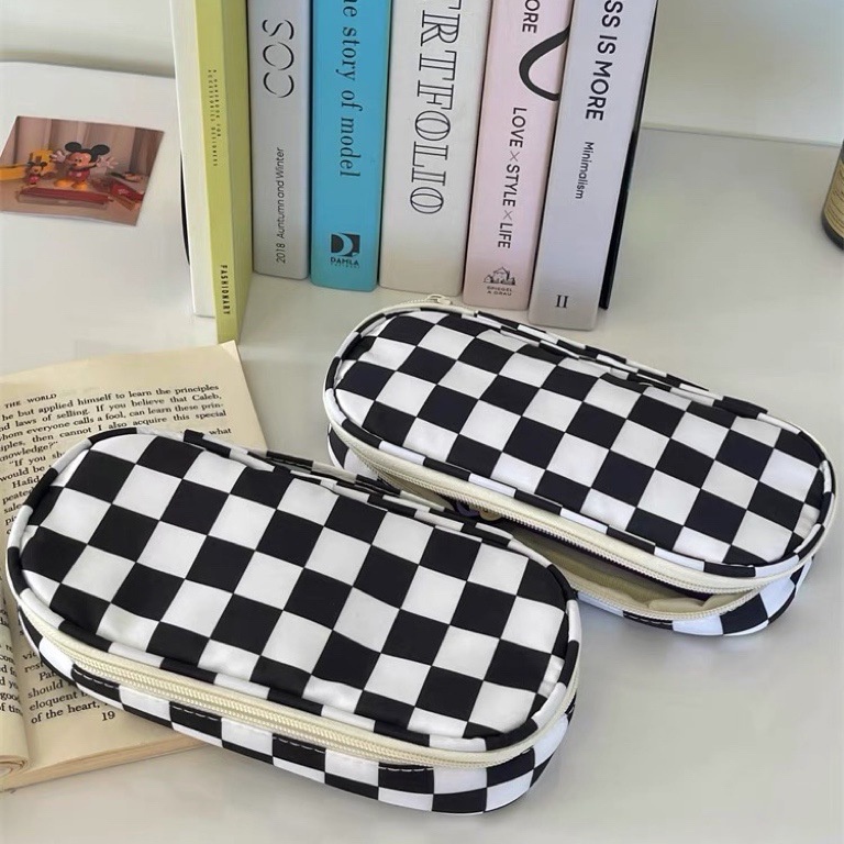 Hộp Đựng Bút Họa Tiết Kẻ Ô Trắng Đen Đơn Giản Phong Cách Ins Cho Học Sinh