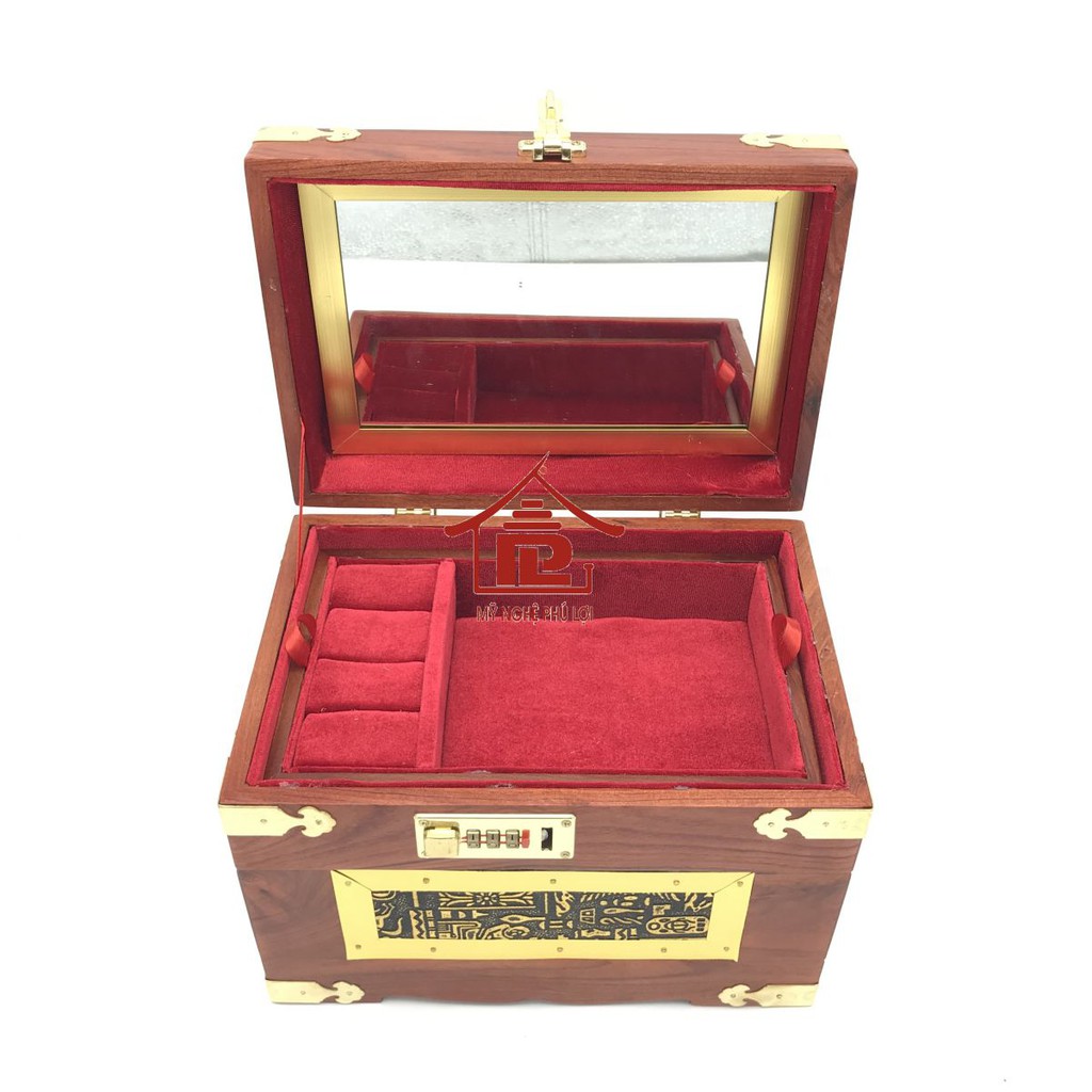Những món trang sức của bạn sẽ không còn nằm bừa bãi trên bàn trang điểm mà chúng sẽ được nằm gọn trong chiếc hộp và bạn có thể mang đi bất cứ đâu. Với màu sắc bắt mắt kết hợp với chất liệu bằng gỗ, các trang sức của bạn sẽ trông đẹp hơn khi được đựng trong chiếc hộp này nhé! Chất liệu: Gỗ hương ta hộp được thiết kế với kiểu dáng mới sang trọng, bên cạnh được tạo gân với phụ kiện bằng đồng lá nguyên chất, khoá số an toàn bạn có thể thay đổi mã một cách dễ dàng, với tay sách tiện lợi phía trên hộp. phía mặt và sau hộp và mặt trên của hộp được thiết kế với chìm được gắn với lớp da thuộc bền đẹp, bên trong được dán bằng vải nhung đỏ, chia ngăn hoặc không tuỳ theo yêu cầu của khách hàng, với 2 size khách nhau để các bạn lựa chọn. KT: dài 33,rộng 22,cao 18 cm
