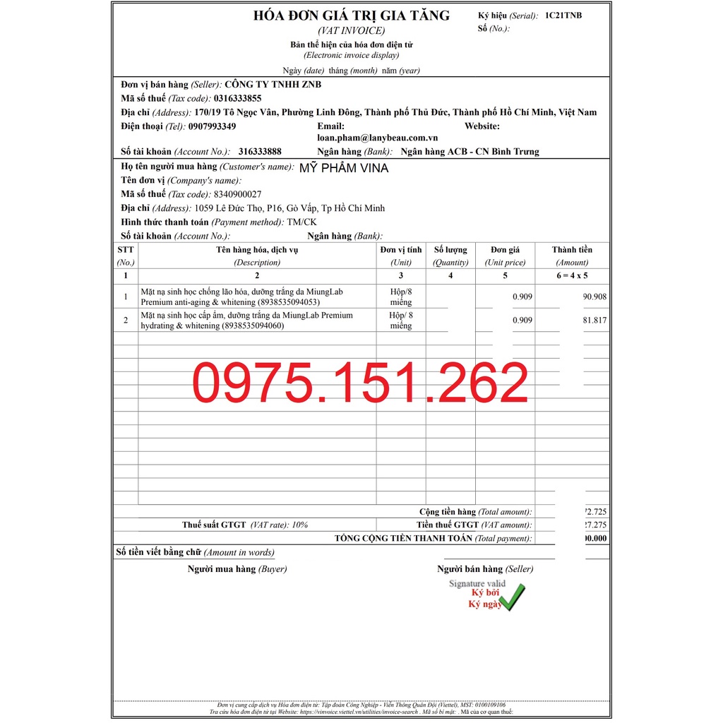 Đặc điểm sản phẩm: – Phôi mặt nạ được lên men tự nhiên từ 100% nước dừa tươi nguyên chất – Khả năng hấp thụ dưỡng chất gấp 20 lần so với trọng lượng khô và gấp 10 lần nguyên liệu mặt nạ thông thường – Mềm mại, mịn màng như làn da thứ 2 ôm sát da mặt giúp bạn vận động thoải mái mà không bị xô xệch – Khả năng tạo cảm giác mát lạnh tự nhiên giúp da thư giãn và thoải mái hơn khi sử dụng – Hoàn toàn từ thiên nhiên, thuần chay an toàn, lành tính – Không cồn – không chất bảo quản – không paraben – không silicon – không sulfate – Không dầu khoáng. Phân loại và công dụng: 1. Mặt nạ cấp ẩm và dưỡng trắng chuyên sâu MiungLab Premium Hydrating & Whitening ( màu xanh ) Công dụng: – Cấp ẩm chuyên sâu, phục hồi và duy trì vẻ căng mướt mịn màng của làn da – Dưỡng trắng da, giảm vết nhăn, mờ đốm đen, giúp da đều màu, sáng mịn đầy sức sống. 2. Mặt nạ chống lão hóa và dưỡng trắng da MiungLab Premium Anti-Aging & Whitening ( màu đỏ ) Công dụng: – Chống lão hóa và săn chắc da, phục hồi da hư tổn, trả lại bạn làn da tươi trẻ đầy sức sống – Dưỡng trắng và cấp ẩm chuyên sâu giúp da trắng sáng, căng mướt và mịn màng. Hướng dẫn sử dụng: – Bước 1: Rửa mặt sạch và lau khô. – Bước 2: Mở bao bì và lấy mặt nạ ra. Tách bỏ lớp vải trước, rồi nhẹ nhàng đắp mặt nạ lên mặt, sau đó tách bỏ lớp nhựa trắng còn lại. – Bước 3: Điều chỉnh và ấn nhẹ nhàng cho mặt nạ bám khít vào da. – Bước 4: Thư giãn khoảng 20 – 30 phút sau đó lột mặt nạ và vỗ nhẹ để dưỡng chất thẩm thấu vào da. Lưu ý và bảo quản: – Không sử dụng mặt nạ khi da đang trong tình trạng bị viêm, sưng, mụn bọc hoặc mủ, – Chỉ sử dụng ngoài da. Tránh tiếp xúc với mắt. Ngừng sử dụng và rửa kỹ bằng nước nếu bị kích ứng. Để xa tầm tay trẻ em. – Bảo quản nơi khô thoáng, tránh nhiệt độ cao và ánh nắng trực tiếp