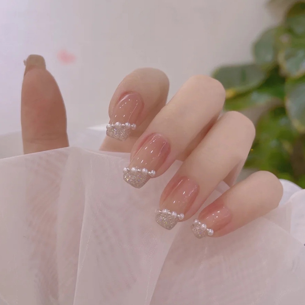 Hộp 24 Móng Tay Giả Màu Trắng Vàng Trong Suốt Chống Nước Có Thể Tháo Rời