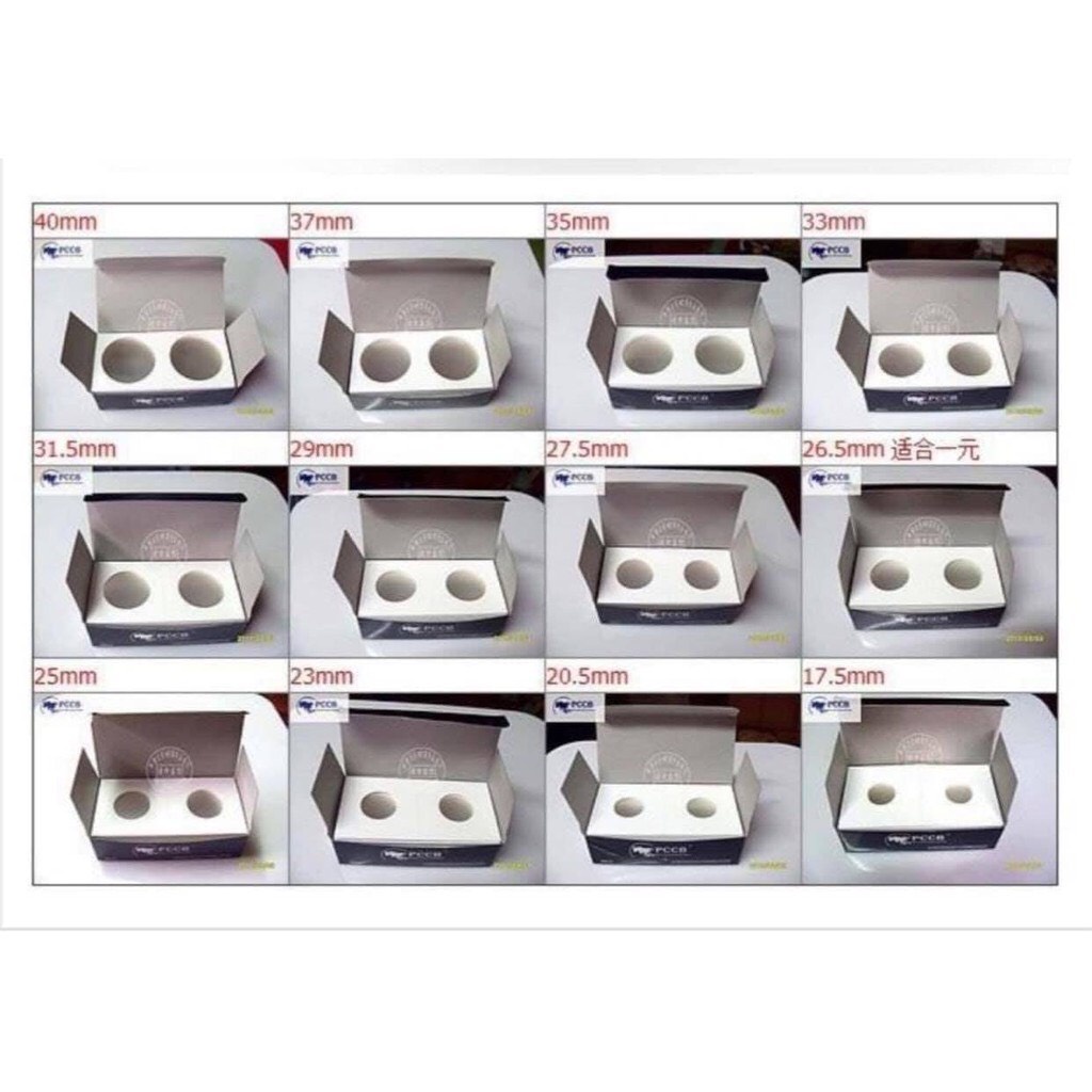 Hộp 50 Cái Holder Kẹp Xu Của PCCB Đầy Đủ Kích Thước Gồm đầy đủ 12 đường kính như sau 1. 17.5mm 2. 20.5mm 3. 23 mm 4. 25 mm 5. 26.5mm 6. 27.5mm 7. 29mm 8. 31.5mm 9. 33mm 10. 35mm 11. 37mm 12. 40mm Holder kẹp xu như hình với nhiều size tương ứng với nhiều k