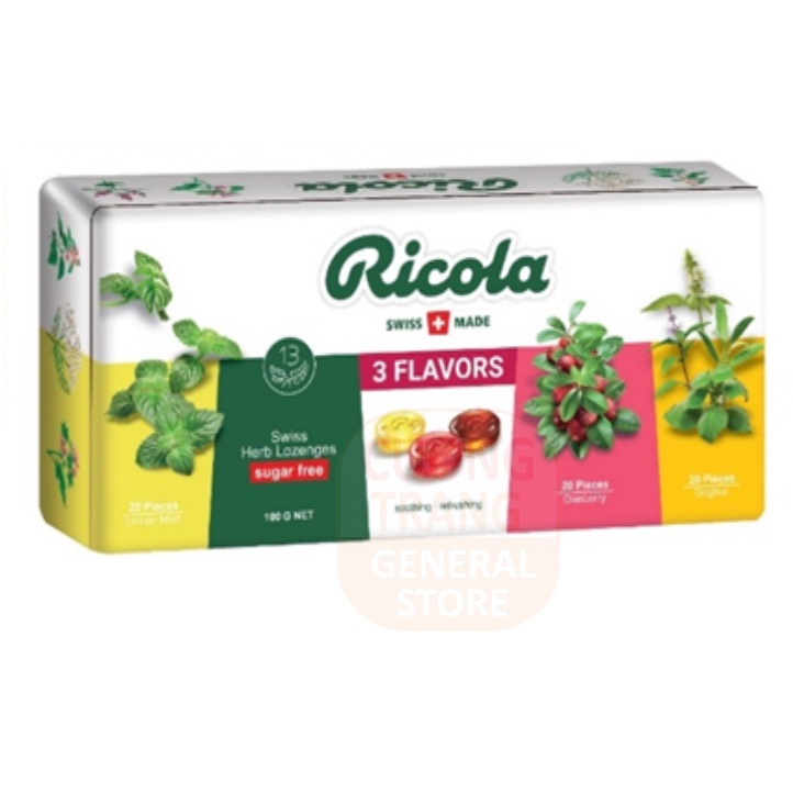 - Hộp kẹo thảo mộc Ricola truyền thống Tet Gift Box 100g gồm 40 gói kẹo nhỏ (20 viên kẹo ngạm Ricola vị Lemon Mint, 20 viên kẹo ngậm Ricola vị Mountain Mint). rất thuận tiện cho chia sẻ và bảo quản, với hương vị tuyệt vời, nhẹ nhàng, sảng khoái và đặc biệt là không