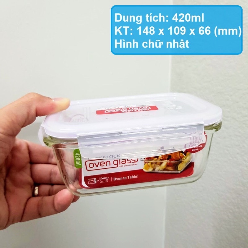 Hộp thủy tinh chịu nhiệt Lock&Lock 420 ml Hộp chữ nhật. Kích thước khoảng: Dài x Rộng x Cao = 14.5 x 10.5 x 6.5 cm Hộp thích hợp mang cơm đi làm, đi học hoặc trữ thức ăn trong tủ lạnh. SẢN PHẨM CHÍNH HÃNG 100% NÊN CÁC BẠN AN TÂM. Chất liệu Hộp thủy tinh chịu nhiệt