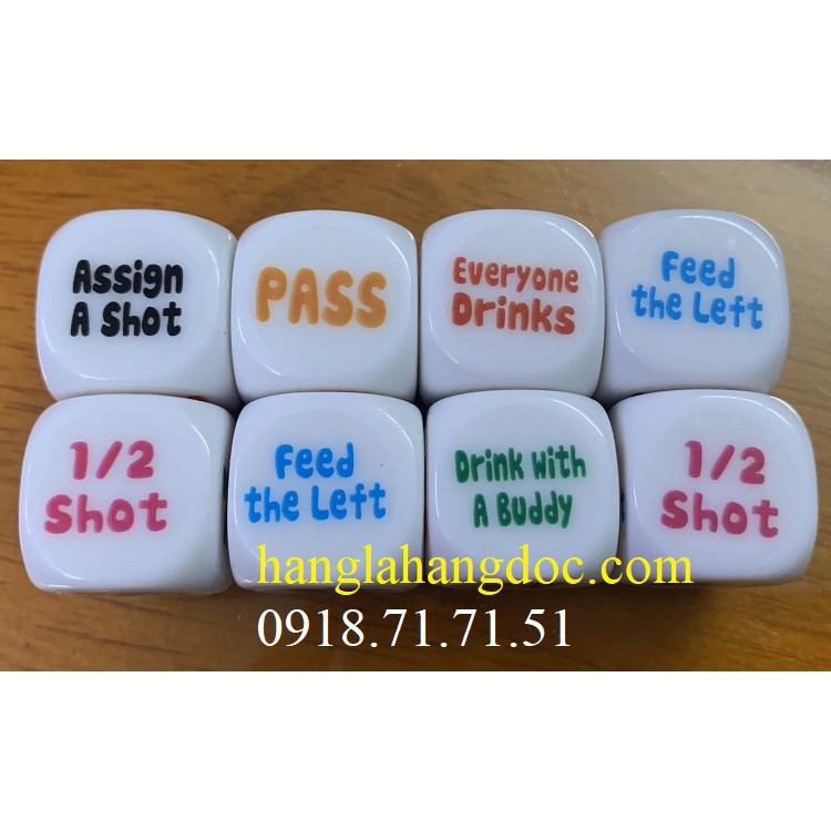 Thông số kỹ thuật: - Chất liệu: Nhựa ABS - Kích thước: 2 x 2 x 2 cm - 6 mặt với 6 khẩu lệnh: + Everyone drinks - mọi người cùng uống + Pass - qua lượt (không phải uống) + 1/2 shot - uống nửa ly + Feed the left - mớm mồi cho người bên trái + Assign a shot - chỉ định 1 người nào đó uống + Drink with a buddy - cạn ly cùng chiến hữu - Xí ngầu chất lượng nên có thể dùng đổ trên bàn, lắc trong tô/ dĩa... - Góp phần tạo nhiều nụ cười & trãi nghiệm vui vẻ bên nhau!!! #drinking_dice #drinkinggame #dochoiannhau #trochoiuongbia #xingauuongbiatienganh #xuc_xac_uong_bia_tieng_anh