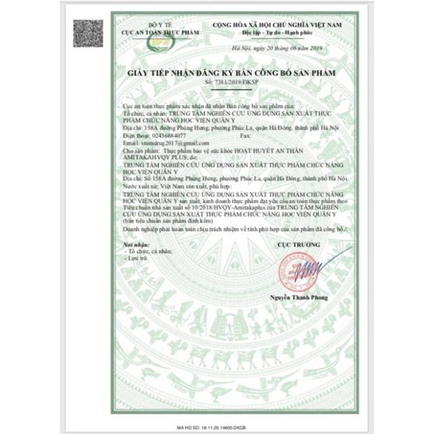 Sản xuất: Học viện Quân Y "Sản phẩm này không phải là thuốc, không thể thay thế thuốc chữa bệnh" Công dụng của Hoạt huyết an thần AMITAKAHVQY Plus Học Viện Quân Y , hay Tanaka Plus Học viện Quân Y cũ. Với các thành phần chiết xuất từ dược liệu thiên nhiên quý hiếm
