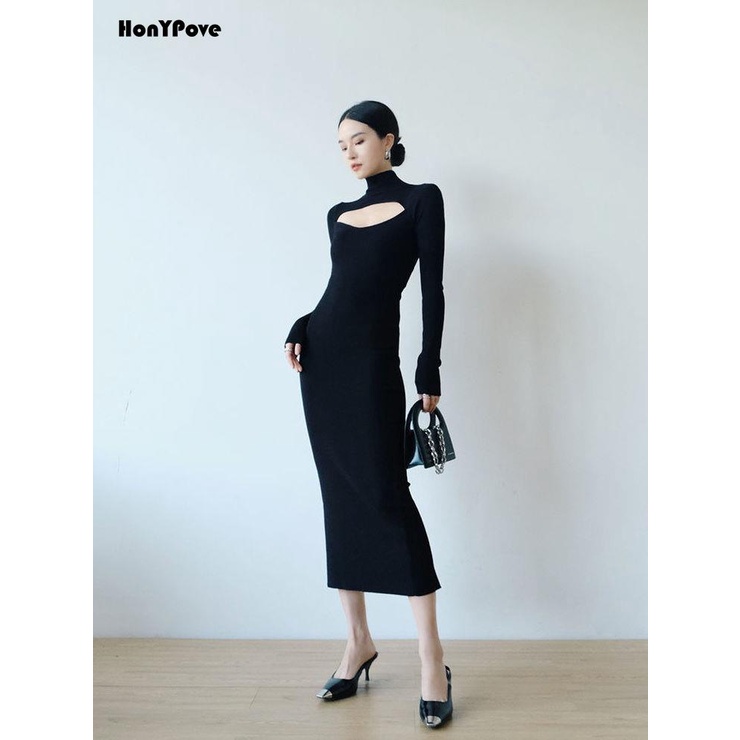 Honypove Đầm Dệt Kim Đen Tay Dài Dáng Ôm Phong Cách Retro Thời Trang Mùa Thu Dành Cho Nữ