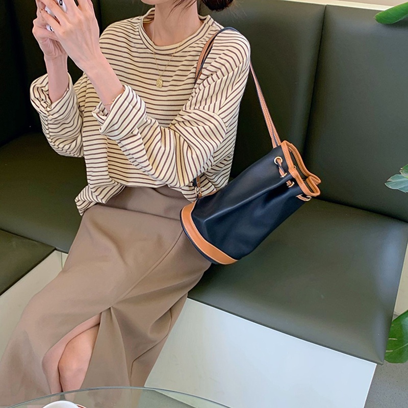 IELGY Áo thun cổ tròn tay dài họa tiết kẻ sọc phong cách Hàn Quốc đơn giản trẻ trung