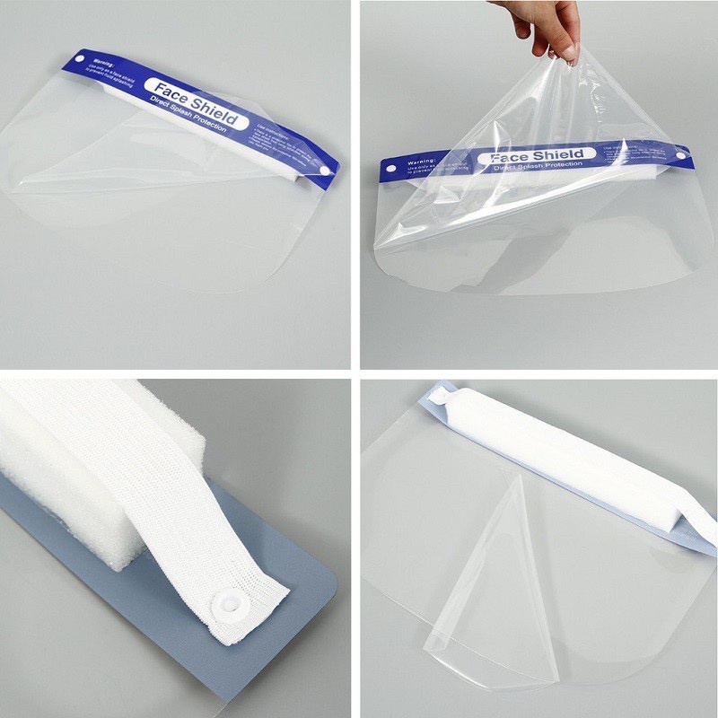 Kính chống giọt bắn - Faceshield Tên sản phẩm : Tấm chắn chống giọt bắn trong suốt nhựa PVC Công dụng : Chắn giọt bắn nước bọt, côn trùng khi đi xe máy Chất liệu : Nhựa PVC cao cấp Cách sử dụng : Gắn vào đầu (Free size) Màu sắc : Trong suốt Tính năng: - Chống chóa,
