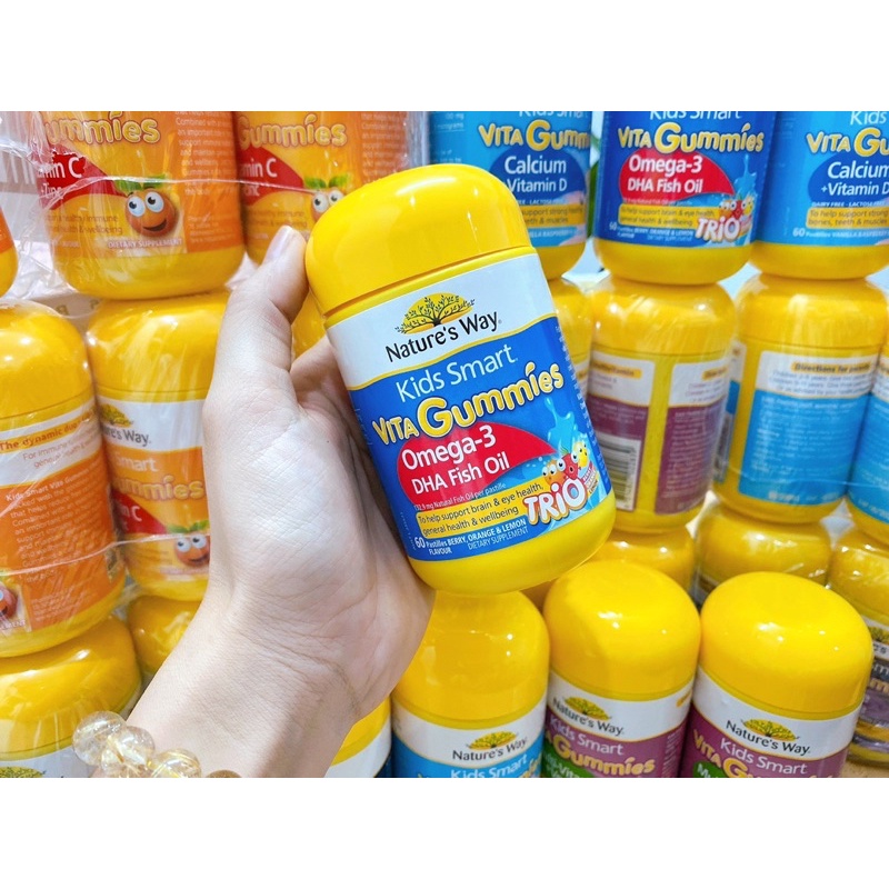 Công dụng đặc biệt của sản phẩm Nature’s Way Kids Smart Vita Gummies - Vita gummies giúp hỗ trợ bổ sung vitamin và các loại khoáng chất cho cơ thể bé một cách hiệu quả - Sản phẩm dạng kẹo dẻo, mềm, thơm tạo sự thu hút cho bé - Kẹo dẻo Nature’s Way Kids Smart Vita Gummies có vị cam, chua chua ngọt ngọt rất dễ sử dụng. - Công thức đặc biệt không gây sâu răng *Hướng dẫn sử dụng Nature’s Way Kids Smart Vita Gummies - Với loại bổ sung vitamin C và kẽm: Độ tuổi: Dùng cho bé từ 2 tuổi trở lên Liều dùng: 1 viên mỗi ngày đối với bé từ 2 đến 3 tuổi và 2 viên/1 ngày đối với trẻ trên 3 tuổi - Với loại bổ sung Calcium và vitamin D : +Trẻ từ 2 - 8 tuổi: dùng 2 viên mỗi ngày +Trẻ từ 9 - 11 tuổi: dùng 3 viên mỗi ngày. Hoặc theo hướng dẫn của chuyên gia y tế +Dùng sau ăn vào buổi sáng - Với loại Bổ Sung Vitamin Tổng Hợp Và Rau Quả +Mỗi ngày bạn chỉ nên cho bé sử dụng tối đa 1 viên đối với bé từ 2-3 tuổi. +2 viên đối với bé từ 4 tuổi trở lên là phù hợp - Với loại Phòng cảm cúm Trẻ em 2-3 tuổi: Ngày dùng 2 viên Trẻ em trên 4 tuổi ngày dùng từ 3-4 - Cho bé ăn ngon: +Đối với trẻ em từ 2 đến 3 tuổi: Mỗi ngày dùng 1 viên +Đối với trẻ em trên 4 tuổi: Mỗi ngày dùng 2 viên -omega +Trẻ từ 2 đến 3 tuổi: 1 viên/ ngày +Trẻ từ 4 tuổi trở lên: 2 viên/ ngày Sản phẩm không phải là thuốc và không có tác dụng thay thế thuốc chữa bệnh