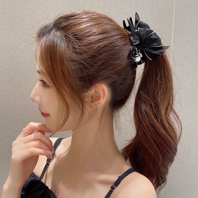 Kẹp Tóc Càng Cua Đính Nơ Lưới Và Lông Vũ Màu Đen Thanh Lịch Thời Trang Cho Nữ