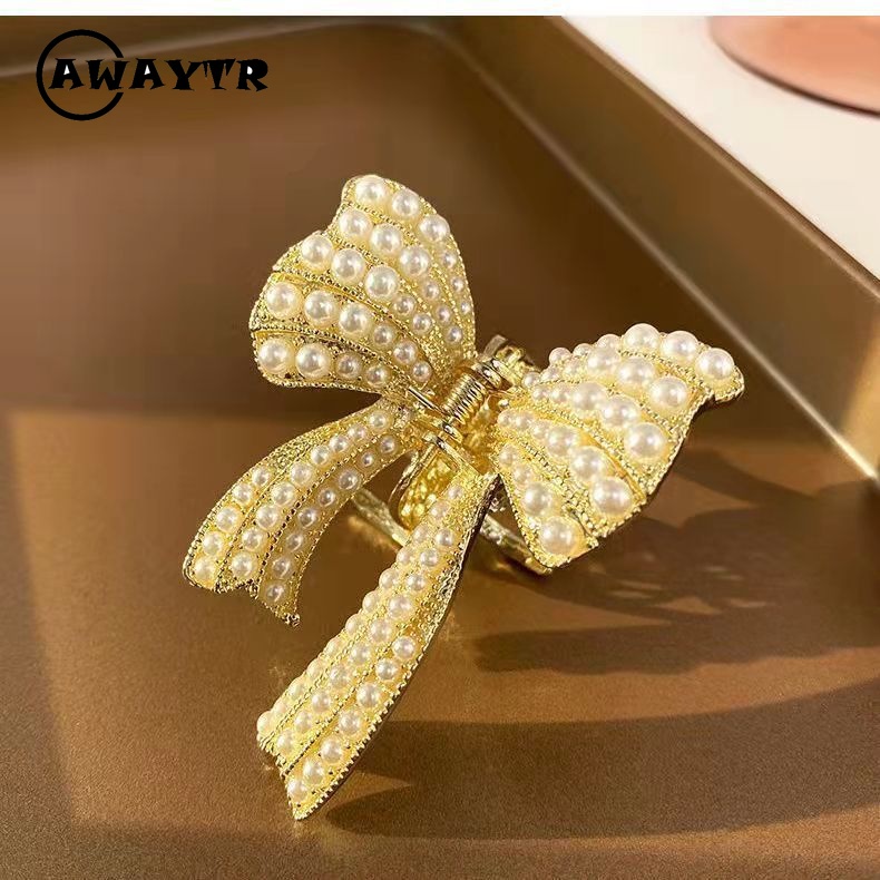 Kẹp Tóc Nơ Ruy Băng Ba Chiều Bằng Kim Loại Đính Ngọc Trai Thời Trang Hàn Quốc