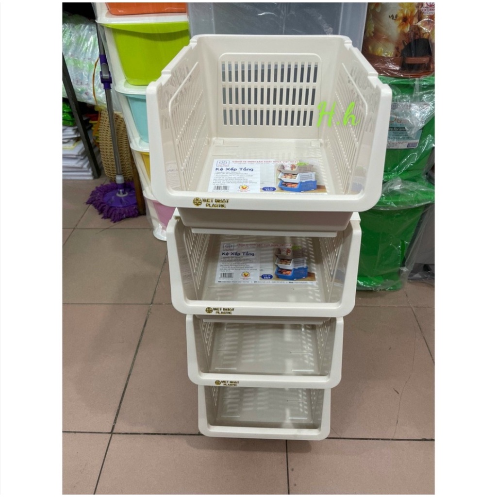 Kệ xếp tầng đa năng Việt Nhật Plastic Màu sắc: kem, xanh- Kích thước: 36 x 27 x 20cm / 1 tầng Bạn có thể dùng 1 khay, 2 khay, 3 khay hay 4,5,6 khay thì tuỳ theo nhu cầu nhé Thiết kế có thể xếp chồng lên nhau, tiết kiệm không gian Nhiều tác dụng: dùng để đựng hoa quả, bát đĩa, quần áo, các vật dụng trong gia đình & văn phòng, ...✔️ Làm kệ bỉm sữa của bé tuyệt vời✔️ Kệ đựng đồ mỹ phẩm✔️ Kệ đựng văn phòng phẩm✔️ Kệ đựng đồ gia vị sang chảnh trong nhà✔️ Kệ đựng đồ trong nhà tắm sang chảnh.✔️ Kệ đựng đồ chơi cho bé Thiết kế sang trọng phù hợp với gian bêp hoặc đề đồ dùng trong nhà Chất liệU nhựa PP cao cấp Chống ẩm và kháng nước tuyệt đối Chống cháy lan, và nhựa thân thiện với môi trường
