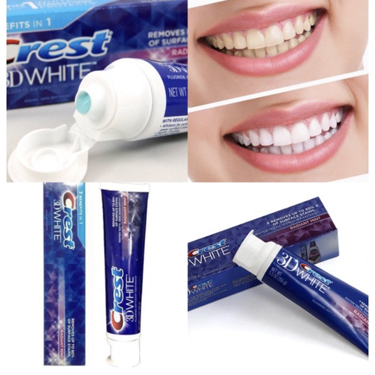 🌹🌹🌹 Kem đánh răng Crest 3D White của Mỹ đủ 2 loại phục vụ nhu cầu khách yêu nè ✅ Xuất xứ: Mỹ - Chính hãng ⛔️ Sản phẩm Nhái/Fake trên thị trường phổ biến. Mọi người tìm nơi uy tín để mua nhé _______________________ 💦💦 PHÂN LOẠI: 🔹 Crest 3D White Advanced Whitening 147gr : Trắng răng sau 3 ngày, sạch mảng bám, Hương bạc hà thơm miệng... (Răng yếu hơi ê một chút vì nó làm trắng răng nhanh nè) 🔹 Crest 3D White Vivid Mint 150gr : Sạch răng, loại bỏ mảng bám, chống ê buốt, chắc khỏe răng, bảo vệ nướu... (ai răng yếu và nhu cầu trắng răng ít hơn nên chọn cái này nè) _______________________ 🎀 Công dụng kem Crest 3D White: ☑️ Kem Đánh Răng Crest 3D White Advanced Whitening giúp hơi thở thơm mát, sảng khoái cực đỉnh ☑️ Kem Đánh Răng Crest 3D White Advanced Whitening Làm trắng răng đến không ngờ, đánh bay 80% vết bẩn trên bề mặt răng ☑️ Với công thức 3X được cải tiến nhằm tiêu diệt Ngăn ngừa sâu răng, bảo vệ răng chắc khỏe, ngừa viêm nứu ☑️ Hương bạc hà băng giá mát lạnh, lan tỏa khắp khoang miệng của bạn. ☑️ Chống mảng bám trong 12 tiếng đồng hồ. ☑️ Kem Đánh Răng Crest 3D White là sản phẩm bán chạy nhất tại Mỹ.