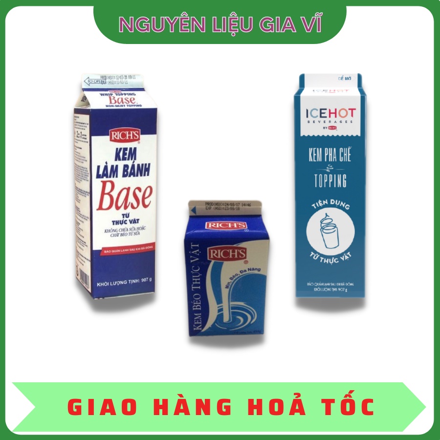Kem Béo Thực Vật Rich - Base - On - Top LƯU Ý RICH'S HOẶC ICHOT TÙY THỜI ĐIỂM NHÉ KHẮCH Khối lượng Rich 454g Khối lượng Base 907g Khối lượng On Top 907g Bảo quản nơi khô ráo, thoáng mát, tránh ánh nắng mặt trời Hsd 1 năm kể từ ngày sản xuất Sản xuất tại Việt Nam C
