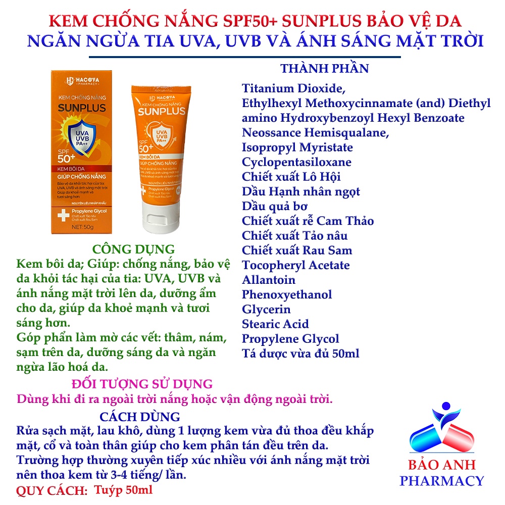 Kem chống nắng SUNPLUS – SPF50+ giúp chống nắng, bảo vệ da khỏi tác hại của tia UVA, UVB và ánh sáng mặt trời, không bết dính – Tuýp 50g THÀNH PHẦN Titanium Dioxide, Ethylhexyl Methoxycinnamate (and) Diethylamino Hydroxybenzoyl Hexyl Benzoate Neossance Hemisqualane,