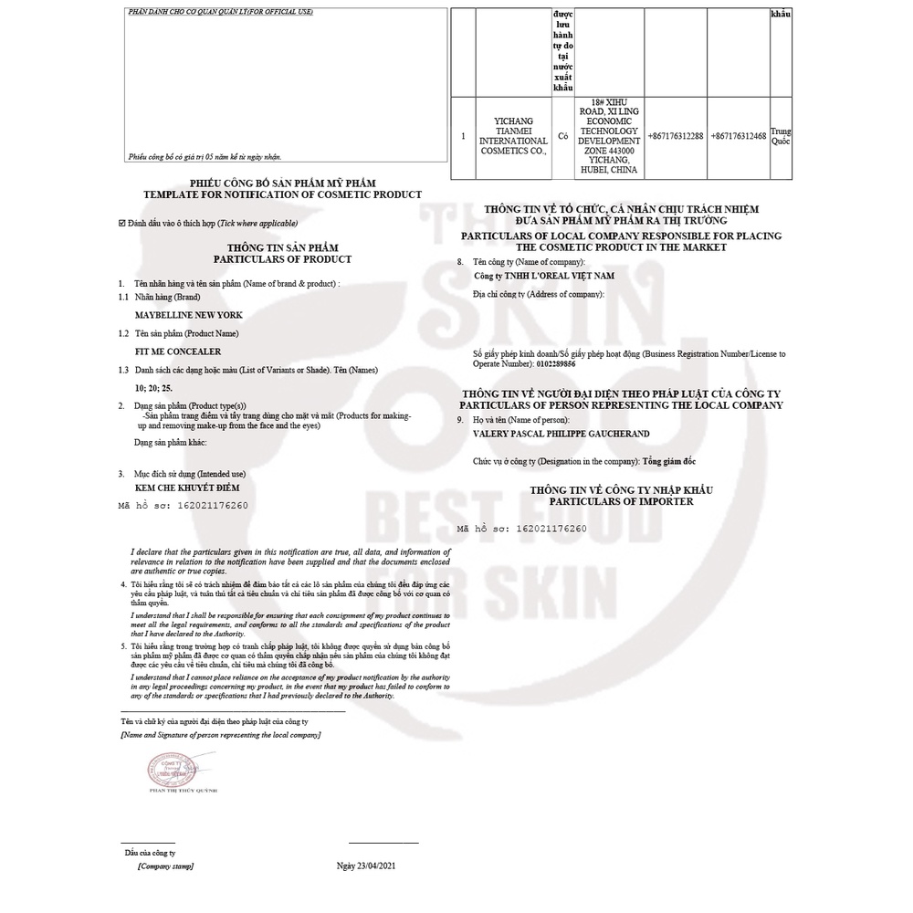 Kem Che Khuyết Điểm Mịn Lì Maybelline Fit Me Concealer With Chamomile Extract 6.8ml • Thương hiệu: Maybelline • Xuất xứ: Mỹ • Sản xuất: Trung Quốc • Dung tích: 6.8ml THÔNG TIN CHI TIẾT * Đặc trưng: - Thiết kế dạng cây thon dài nhỏ gọn, đầu cọ vát gắn liền với nắp cọ để bạn dễ dàng apply sản phẩm lên da - Phía trên thân sản phẩm logo và thông tin về sản phẩm được in rất rõ ràng và chi tiết cho abnjd dễ quan sát - Chứa thành phần Glycerin giúp cấp ẩm và duy trì độ ẩm cho da luôn được ẩm mượt - Kết cấu dạng lỏng, độ che phủ khá cao, chất kem mỏng mịn và tự nhiên, dễ tán và thẩm thấu nhanh vào da một cách mượt mà - Mỏng nhẹ, giúp che giấu các khuyết điểm trên da vô cùng tự nhiên - Che phủ hiệu quả quầng thâm và các khuyết điểm như mụn, thâm, sạm. - Có thể sử dụng như sản phẩm đa năng, hỗ trợ nhấn sáng và tạo khối - Che phủ khuyết điểm và màu da tức thì, mang đến làn ra sáng mịn, rạng ngời - Nhỏ gọn, tiện lợi và dễ mang theo sử dụng Hiện tại Thế giới SkinFood có các tông màu: #10 LIGHT #15 FAIR #20 SAND * Hướng dẫn sử dụng: Dùng một lượng kem thích hợp lên vùng da có khuyết điểm. Dùng ngón tay miết nhẹ, tản đều kem để tạo lớp che khuyết điểm mỏng mịn thật tự nhiên. Có thể tán nhiều lớp để đạt đến hiệu quả che phủ bạn mong muốn. Dùng phấn phủ lên để giữ lớp che khuyết điểm bền màu hơn. * Hạn sử dụng: 3 năm kể từ ngày sản xuất/NSX xem trên bao bì