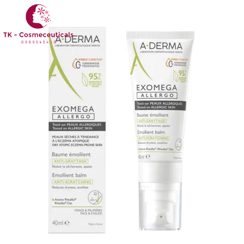 (MẪU MỚI) Kem Dưỡng Ẩm ADERMA EXOMEGA ALLERGO Dành Cho Da Khô, Da Cơ Địa, Chàm Thể Tạng + Kem dưỡng ẩm giảm ngứa ADERMA EXOMEGA ALLERGO Emollient Cream là giải pháp chuyên biệt giúp hỗ trợ kiểm soát da cơ địa hay da quá khô. Chỉ cần sử dụng một lần mỗi ngày là bạn đã có thể làm dịu làn da của mình một cách đáng kể. Đặc biệt sản phẩm không chứa Paraben, không hương liệu, không chất bảo quản đảm bảo an toàn cho người dùng. + Thành phần - Dịch chiết toàn phần yến mạch Rhealba và acid béo thiết yếu Omega 6- Không hương liệu- Ít gây dị ứng- Không gây nhân trứng cá. - Aqua, caprylic triglyceride, glycerin,cetearyl, alcohol, niacinamide, 10-hydroxydecenoic acid, avena sativa leaf/stem extract, ceterary glucoside, cetyl alcohol, glyceryl stearate, evening primrose oil, Công dụng của ADERMA EXOMEGA ALLERGO Kem dưỡng ẩm giảm ngứa ADERMA EXOMEGA ALLERGO Emollient Cream là giải pháp chuyên biệt giúp hỗ trợ kiểm soát da cơ địa hay da quá khô. Chỉ cần sử dụng một lần mỗi ngày là bạn đã có thể làm dịu làn da của mình một cách đáng kể. Xua tan cảm giác ngứa rát, kích ứng, khô căng ở da. + Hướng dẫn sử dụng: - Dùng 1 lần/ngày. Thoa kem lên vùng da sạch và khô của mặt và thân thể sau khi rửa sạch da - Không thoa kem trên vùng da ướt. + Đối tượng sử dụng Kem dưỡng ẩm giảm ngứa ADERMA EXOMEGA ALLERGO Emollient Cream dùng cho trẻ em, trẻ sơ sinh và người lớn trong trường hợp da bị khô, kích ứng, da cơ địa (chàm thể tạng). Quy cách đóng gói: Tupe vô trùng 40ml và 200ml Thương hiệu: ADERMA Sản xuất: Pháp