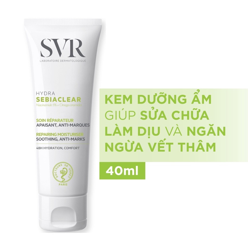 Kem dưỡng ẩm dành cho da dầu mụn, dưỡng da mềm mịn và giúp làm mờ vết thâm sau mụn SVR Sebiaclear Hydra 40ml Kem dưỡng ẩm cho da dầu mụn SVR Sebiaclear Hydra 40ml là sản phẩm chăm sóc da không chỉ dành cho da dầu mụn mà đặc biệt còn dùng cho da nhạy cảm và dễ bị kích