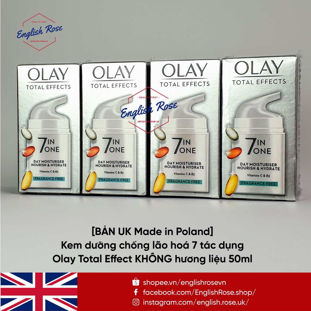 LƯU Ý: Mẫu mới OLAY Không Hương liệu (Fragrance Free) vỏ trắng có ghi trên vỏ là DAY MOSTURISER (Kem ngày). Tuy nhiên bản mới này Không có SPF và bảng thành phần hoàn toàn giống loại mẫu cũ vỏ đen (hãng xác nhận chỉ có tăng thêm hàm lượng Vitamin C), nên quý khách hoàn toàn có thể sử dụng được cho cả NGÀY và ĐÊM. Trên hdsd của website chính thức của Olay cũng có hướng dẫn sản phẩm OLAY Không Hương liệu (Fragrance Free) vỏ trắng có thể dùng được cho NGÀY và ĐÊM *** Tất cả sp bán tại shop đều có bill Anh do mình (chủ shop) hiện sống Anh tự mua và gửi về, KHÔNG qua bất kì trung gian nào. *** 100% sp được mua tại các website và chuỗi cửa hàng lớn nhất và uy tín nhất của Anh. Kem dưỡng ban ngày với tác dụng chống 7 dấu hiệu lão hóa: 1. Giảm rõ rệt sự xuất hiện của đường nhăn và nếp nhăn 2. Dưỡng ẩm và nuôi dưỡng da mềm mịn hơn 3. Làm đều màu da 4. Tinh chỉnh lỗ chân lông 5. Làm mịn kết cấu của da 6. Làm sáng 7. Giúp phục hồi độ săn chắc của da. Chất kem giàu dưỡng, thấm nhanh, không nhờn, không làm tắc nghẽn lỗ chân lông Bao gồm các thành phần hiệu quả cho da như như Niacinamide, Pro-Vitamin B5 và Vitamin E, trả lại vẻ trẻ trung cho làn da của bạn. XIN LƯU Ý: Hàng nội địa UK thường không có tem/giấy bạc niêm phong, không ghi HSD (Vì theo luật Anh và EU không yêu cầu). HSD được tính từ ngày mở nắp (xem biểu tượng cái hộp mở nắp trên bao bì). Nhiều hãng thường xuyên thay đổi mẫu mã, thậm chí thay đổi kết cấu/thành phần. Nếu có bất kì thắc mắc nào xin quý khách vui lòng liên hệ shop để được giải đáp ạ.