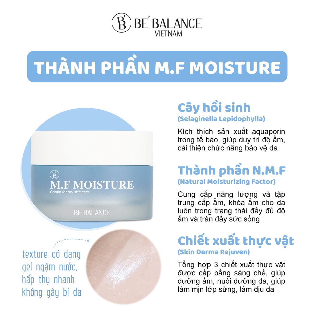 BE'BALANCE M.F MOISTURE CREAM có dạng gel mềm mịn thấm đều trên da mà không gây nhờn rít hoặc bí lỗ chân lông. Giúp da luôn ẩm và khoẻ mạnh. THÔNG TIN SẢN PHẨM Công dụng: - Bật “hệ thống nước” của da, giúp đưa nước vào sâu bên trong các tế bào. - Khoá và giữ ẩ