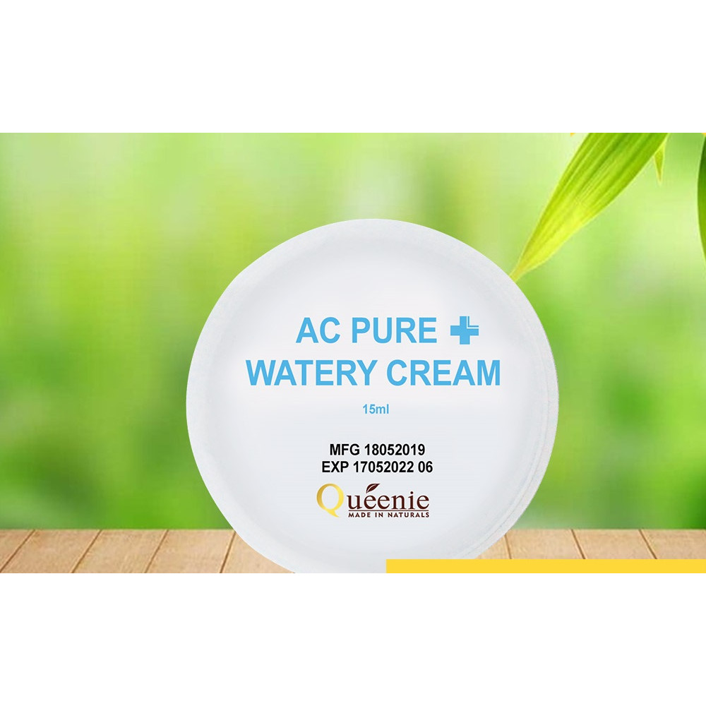 Kem dưỡng da Queenie AC Pure trải nghiệm 15ml - Mỹ phẩm Hàn Quốc Được phát triển với hoạt tính cao dựa trên công nghệ sinh học và lên men tự nhiên từ lúa mạch kết hợp với nọc ong, tinh dầu bưởi, nho, khuynh diệp, sâm cổ, trái thanh yên, Kem dưỡng Queenie Ac Pure Watery Cream - Mỹ phẩm Hàn Quốc cho hiệu quả thẩm thấu nhanh, cải thiện ngay: + Cung cấp và giữ lại dưỡng chất thẩm thấu sâu vào lớp trung bì, phục hồi cấu trúc da săn chắc, se khít lỗ chân lông một cách bất ngờ.+ Dưỡng da khỏe đẹp, tươi trẻ, trắng sứ lên từng ngày.Sản phẩm tốt cho mọi loại da, đặc biệt tốt cho da yếu, da dầu, da mụn, sẹo thâm, không đều màu. Sản phẩm không chứa chì, kim loại nặng, paraben và các chất gây hại cho da. Hướng dẫn sử dụng:Lấy 1 lượng kem vừa đủ ra lòng bàn tay, thoa đều kem lên mặt và massage nhẹ nhàng cho dưỡng chất hấp thụ hoàn toàn vào da. Sử dụng đều đặn ngày 2 lần: Sáng và tối. Nơi sản xuất: Hàn QuốcSản phẩm được Cục quản lý Dược, mỹ phẩm Hàn Quốc KFDA, KCA, Bộ Y tế Việt Nam cấp phép lưu hànhGiá sản phẩm trên Tiki đã bao gồm thuế theo luật hiện hành. Bên cạnh đó, tuỳ vào loại sản phẩm, hình thức và địa chỉ giao hàng mà có thể phát sinh thêm chi phí khác như phí vận chuyển, phụ phí hàng cồng kềnh, thuế nhập khẩu (đối với đơn hàng giao từ nước ngoài có giá trị trên 1 triệu đồng).....