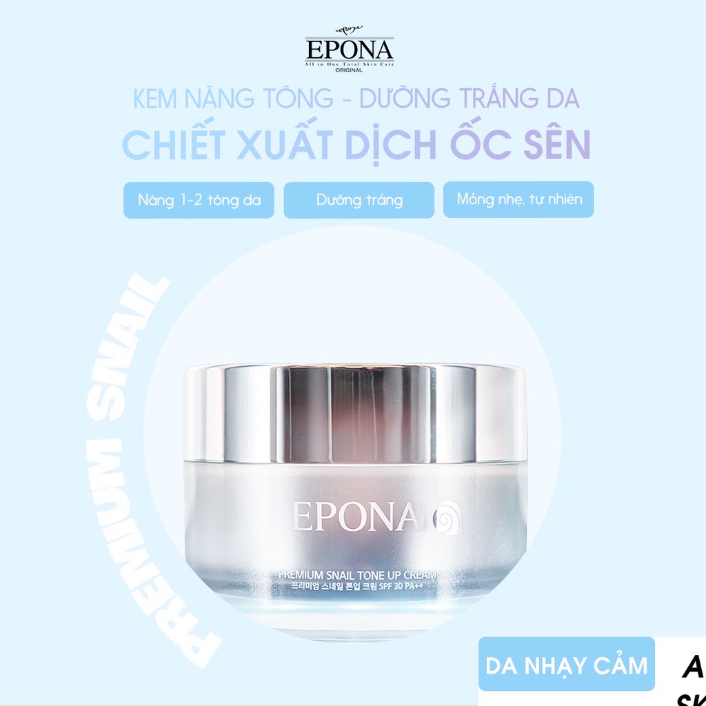Kem Dưỡng Epona, Nâng Tone, Chống Lão Hoá, Dưỡng Trắng, Giảm Nám, Ốc Sên, Cá Hồi, Ngựa, Hồng Sâm 50ml • Thương hiệu: Epona • Xuất xứ: Hàn Quốc • Dung tích: 50ml Epona Premium Snail Tone Up Cream SPF 30 PA++ 50ml Epona All In One Total Skin Care Intensive 50ml Epona Pr
