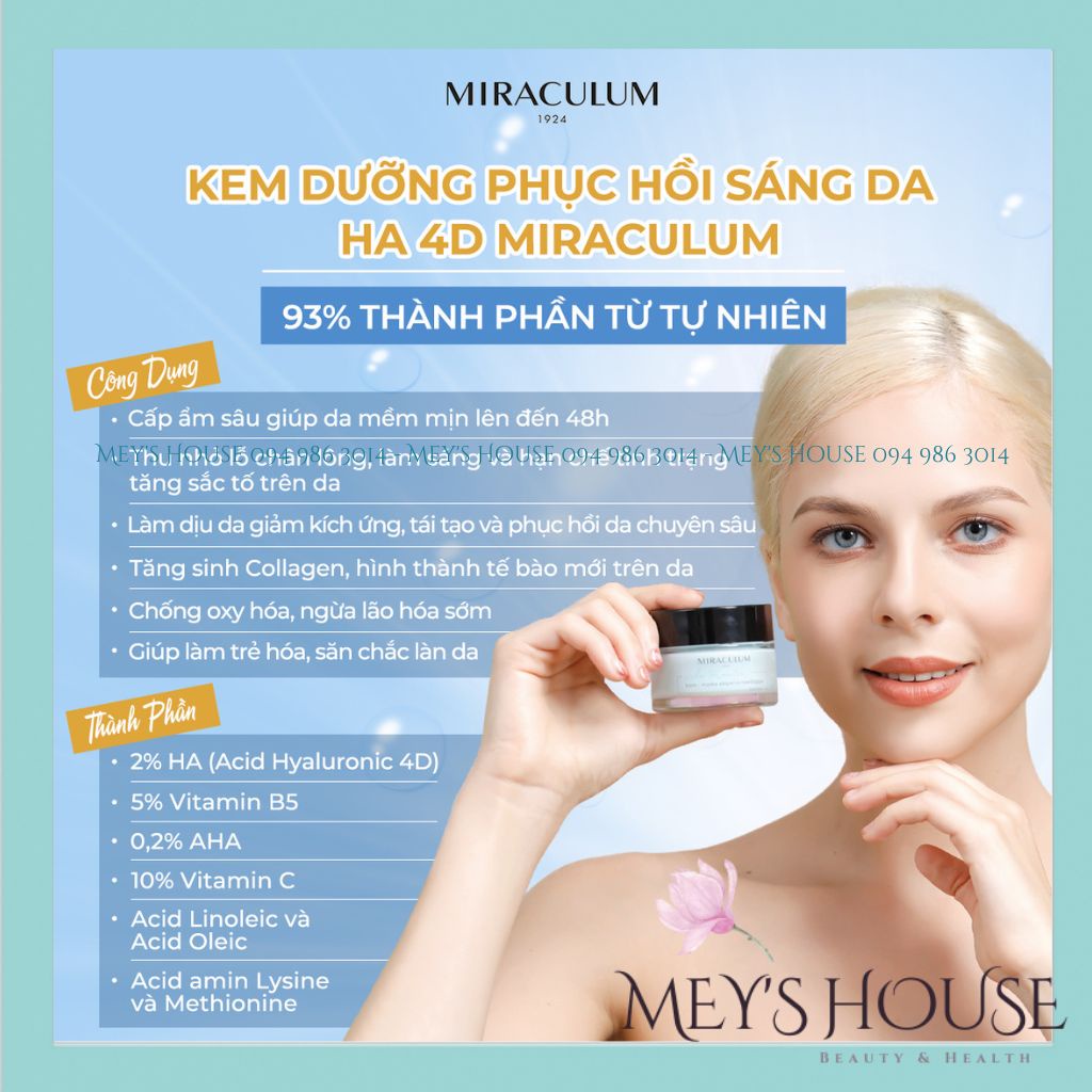 QUÝ KHÁCH HÀNG HÃY YÊN TÂM KHI MUA HÀNG TẠI MEY’S HOUSE: ✅ CAM KẾT BÁN HÀNG CHÍNH HÃNG, BÁN ĐÚNG GIÁ NIÊM YẾT, TUYỆT ĐỐI KHÔNG BÁN PHÁ GIÁ SẢN PHẨM KÉM CHẤT LƯỢNG ✅ HOÀN TIỀN 100% NẾU PHÁT HIỆN HÀNG GIẢ, HÀNG NHÁI ✅ SẴN SÀNG TƯ VẤN, GIẢI ĐÁP, MỌI THẮC MẮC CỦA KHÁCH HÀNG VỀ SẢN PHẨM ✅ ĐỘI NGŨ TƯ VẤN NHIỆT TÌNH, CÓ TÂM --------------- Miraculum là thương hiệu mỹ phẩm lịch sử gần 100 năm, nổi tiếng vì mọi hoạt chất và thành phần trong sản phẩm đều theo tiêu chuẩn y khoa da liễu nên mang lại hiệu quả mỹ mãn cho người dùng. THÔNG TIN SẢN PHẨM : Kem Dưỡng Sáng Da Miraculum Thermal Water Active Phục Hồi Tái Tạo Da 30ml 1. CÔNG DỤNG : - Giúp cấp ẩm sâu giúp da mềm mịn lên đến 48h. - Tăng sinh Collagen giúp làm chậm quá trình lão hóa. - Làm đều màu da, dưỡng ẩm chuyên sâu, giúp thu nhỏ lỗ chân lông, làm sáng và hạn chế tình trạng tăng sắc tố trên da. - Làm dịu da giảm kích ứng, tái tạo và phục hồi da chuyên sâu. - Sản phẩm giúp dưỡng ẩm và ngăn ngừa lão hóa giúp da săn chắc và mịn màng. 2. LOẠI DA PHÙ HỢP : - Với những nền da khô, da đang treatment, da đang kích ứng mẩn đỏ, da cần tái tạo chuyên sâu, da mỏng yếu cần phục hồi nhanh. - Không chứa cồn, Paraben, hương liệu an toàn và lành tính cho mọi loại da nhất là da nhạy cảm. 3. THÀNH PHẦN : 93% từ tự nhiên với 2% Ha ( Acid Hyaluronic), 5% Vitamin B5, 0,2% AHA, 10% Vitamin C, Acid Linoleic và Acid Oleic, Acid amin Lysine và Methionine. 4. HƯỚNG DẪN SỬ DỤNG - Bước 1: Rửa mặt sạch theo các bước làm sạch da hằng ngày. - Bước 2: Lấy 1 lượng kem vừa đủ vào đầu ngón tay, sau đó chấm lên các vị trí như trán, cằm, mũi, hai má,… - Bước 3: Nhẹ nhàng massage đều khắp mặt, dùng tay vỗ nhẹ để kem thẩm thấu vào da tốt hơn. - Mỗi ngày, bạn chỉ cần sử dụng 2 lần vào buổi sáng và tối. Nên kết hợp sử dụng Serum HA Miraculum để cấp ẩm trước khi bôi kem dưỡng phục hồi sáng da Miraculum. LƯU Ý: - Chỉ sử dụng ngoài da. Tránh tiếp xúc với mắt. Để xa tầm tay trẻ em. 5. HƯỚNG DẪN BẢO QUẢN - Bảo quản nơi khô ráo, tránh tiếp xúc với ánh sáng. 6. THÔNG TIN THÊM: - Thương hiệu: Miraculum - Xuất xứ: Ba Lan - Hạn sử dụng: 24 tháng kế từ ngày sản xuất - Ngày sản xuất: In trên bao bì sản phẩm 7. LIÊN HỆ Fanpage: Mey’s Cosmetics – Mỹ Phẩm Chính Hãng HOTLINE/ZALO: 094 986 3014 -------------------- #MiraculumThermalWaterActive #kemduongda #kemduongam #kemchongnang #chamsocda #chonglaohoa #mypham #Miraculum #duongda #kemduongdachinhhang #lamdep #makeup #kemduongdamiraculum #kemduongdabanngay #kemduong #kemduongsangda #phuchoida #duongam