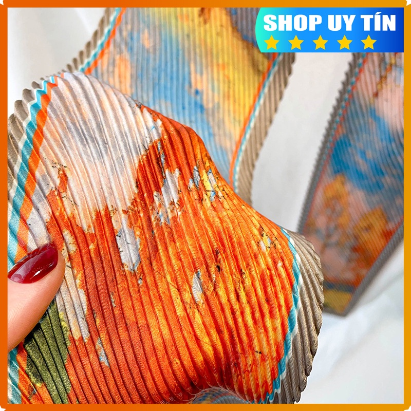 Khăn lụa dập li cao cấp 10x130cm , mẫu mới nhất 2022 Mô tả sản phẩm: Chất liệu Lụa vải mát, siêu nhẹ, siêu mềm thông thoáng và mát Sử dụng và phối đồ: Thích hợp làm phụ kiện đi du lịch như buộc tóc ngoài ra còn dùng để quấn cổ giữ ấm, trang trí túi xách,... và tỉ ti