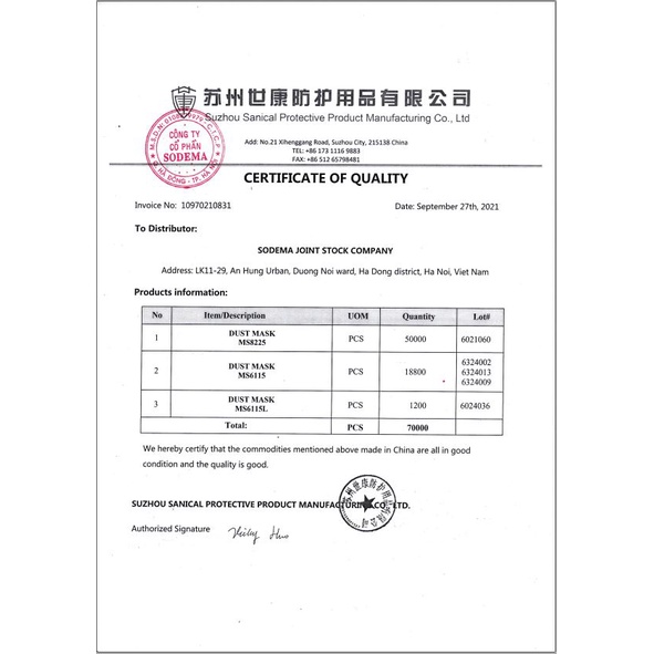 Khẩu trang N95 BENEHAL MS6115 dạng cup màu trắng được CDC Hoa Kỳ khuyến nghị sử dụng ở các thành phố ô nhiễm không khí, phân xưởng, nhà máy công nghiệp. Sản phẩm có khả năng lọc các hạt siêu nhỏ kích thước đến 0.3μm (bụi mịn PM2.5), lọc mùi, kháng khuẩn từ các môi trường: - Các nguồn như khí thải nhà máy sản xuất, khu công nghiệp, phương tiện giao thông, công trình xây dựng, tro bụi đốt rác,… - Lọc bụi phát sinh ở các xưởng cơ khí, xưởng mộc, xưởng sơn tĩnh điện, đánh bóng, chà nhám,... - Lọc mùi hoá chất hàng ngày như nail, ép nhuộm tóc, sơn Pu ở nơi thoáng, sơn ô tô, hàn xì, cắt hơi, cắt laze, phun thuốc trừ sâu,... - Sản phẩm đã được sử dụng tại bệnh viện để phòng dịch, các vùng có nguy cơ lây nhiễm dịch bệnh cao ******************************************** Đặc điểm: - 100% nguyên liệu tự nhiên vải không dệt; an toàn, không gây kích ứng. - Thiết kế 3 lớp, chất liệu lọc cao cấp với hiệu suất trung bình 99% - Không có mùi khó chịu ngay cả trên sản phẩm mới và sau thời gian sử dụng - Dây đeo qua đầu không đau tai trong trường hợp phải đeo thời gian dài liên tục. Có thể điều chỉnh độ dài dây đeo - Thiết kế hợp lý, ôm khít toàn bộ khuôn mặt. (*) Lưu ý: Luôn đọc và làm theo hướng dẫn của nhà sản xuất khi sử dụng. Đeo và sử dụng khẩu trang không đúng cách có thể làm giảm hoặc mất tác dụng lọc bụi siêu mịn của khẩu trang. Khẩu trang đeo khít đòi hỏi phải hoàn toàn tiếp xúc với da mặt, che kín cả mũi và miệng. Luôn luôn sử dụng cả hai dây đeo để giữ khẩu trang đúng vị trí. ******************************************** Mã sản phẩm: MS6115 Hãng sản xuất: Suzhou Sanical Protective Product Mfg/ Thương hiệu BENEHAL Xuất xứ: China Đóng gói: 20 cái/ hộp. Lưu ý: sản phẩm đăng bán nguyên hộp, không bán lẻ Chứng chỉ: Giấy ủy quyền của nhà sản xuất, FSC (chứng chỉ lưu hành tự do), Chứng nhận FDA (Cục Quản lý Thực phẩm và Dược phẩm Hoa Kỳ), Chứng nhận NIOSH N95, CO CQ (Giấy chứng nhận xuất xứ, chất lượng), Test report, Catalog. Sản phẩm được nhập khẩu trực tiếp chính hãng bởi SODEMA JSC, phân phối bởi MADO CO LTD. Cam kết về chất lượng sản phẩm. Liên hệ 0345.86.2021 để được tư vấn miễn phí. Công ty TNHH MADO Địa chỉ: 234 Lê Trọng Tấn, Phường La Khê, Quận Hà Đông, Hà Nội. #MS6115 #MS6115L #sodema #mado #khautrang #khautrangn95 #N95 #N95mask #khautrangyte #niosh #benehal #CDC #chongbui #khautrangphongdich #buimin #locbui #mask #khoibui #vikhuan #4lop #pm2.5 #mautrang #khongvan #chinhhang #khongdautai #khangkhuan