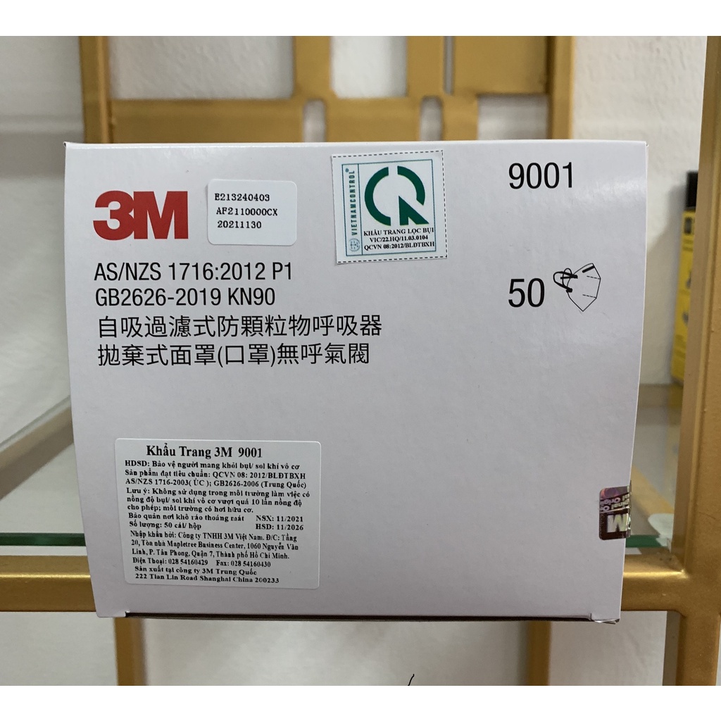 Khẩu trang 3M 9001 được thiết kế gọn nhẹ, dây đeo qua tai, đem lại sự thoải mái và thuận tiện cho người sử dụng, Ngày nay, với sự gia tăng ô nhiễm môi trường, cùng sự bùng nổ của các hoạt đông công nghiệp, các dịch bệnh...thì vấn đề đảm bảo sức khỏe, đặc biệt là sức khỏe đường hô hấp ngày càng được quan tâm đặc biệt. Các loại khẩu trang cần được trang bị hiện đại hơn. Khẩu trang 3M sẽ góp phần tăng cường bảo vệ đường hô hấp cho người sử dụng. Màng lọc tiên tiến với các sợi tích điện ngăn bụi, giúp lọc tối thiểu 90% các hạt bụi siêu nhỏ, đặc biệt là bụi 2.5PM có kích thước rất nhỏ: từ 1 đến 2.5 micromet, chỉ bằng 1/40 sợi tóc người Thanh kim loại trên mũi có thể điều chỉnh tạo độ khít của khẩu trang với gương mặt, tăng khả năng bảo vệ. Cấu tạo màng lọc tĩnh điện, có dây đeo bằng thun kèm nẹp thép ngay mũi để điều chỉnh khẩu trang ôm sát khuôn mặt, dễ dàng sử dụng Sử dụng phù hợp trong môi trường bụi mịn, nhiều sương mù, đặc biệt được khuyên dùng trong môi trường xây dựng, phun xịt thuốc trừ sâu, phun sơn hoặc trong quá trình hàn, mài, cắt kim loại, y tế… Gần như không gây mờ kính khi đeo Cấu trúc 3D khiến khẩu trang không chạm mồm, không dính son nên sạch lâu hơn Dây đeo chắc chắn, rất khó đứt Là dòng khẩu trang KN (không chống dầu) Không giới hạn thời gian sử dụng, đồng nghĩa với việc nếu mà khẩu trang không bị rách, hỏng thì vẫn có thể tiếp tục sử dụng. Thương hiệu 3M Xuất xứ thương hiệu: Mỹ Nước sản xuất: Trung Quốc
