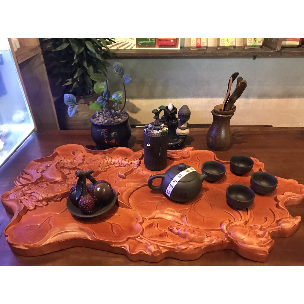 Khay Trà Gỗ Thịt Nguyên Khối Gỗ Gõ Họa Tiết Hoa sen