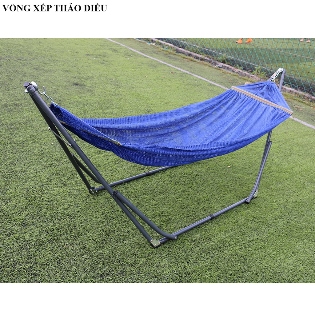 Khung võng sơn cỡ người lớn loại khung võng xếp sơn sáng bóng , không phai màu sau nhiều năm sử dụng. Thiết kế đẹp sang trọng, gọn gàng lắp đặt dễ dàng. Bảo hành chính hãng 12 tháng. **Xuất xứ : Việt Nam** Thương hiệu : khung võng Thảo Điều* *Tải trọng tĩnh : 250kg* *Kích thước khi đóng gói: 113 x 14.5 x 19.5 cm* *Chiều dài khung khi sử dụng: 259 x 74,5 x 79,0 cm* *Kiểu dáng : Kiểu sơn cỡ người lớn* *Chất liệu khung :sơn màu sắc sáng bóng, sang trọng * **Võng lưới 2 lớp cán thép loại tốt có ưu điểm là không bị đứt dây, không bị giản xệ vì sản phẩm này được may bằng cán thép dính liền với phần lưới võng. Lưới võng được dệt kim có các lỗ đều nhau tạo cảm giác êm ái và thoáng mát khi sử dụng*Chất liệu lưới võng: Lưới dệt kim 100% polyester thông thoáng *Chất liệu cán võng: Cán thép lớn được bọc chỉ dù *Kích thước: Phù hợp với các loại khung võng cỡ lớn trên thị trường. Có 3 khoen điều chỉnh kích thước theo nhu cầu sử dụng. *Kiểu dáng: Cán thép không sợ đứt dây *Màu sắc: màu xanh dương, xanh lá *Đối tượng sử dụng: Sử dụng cho cả người lớn và trẻ em.