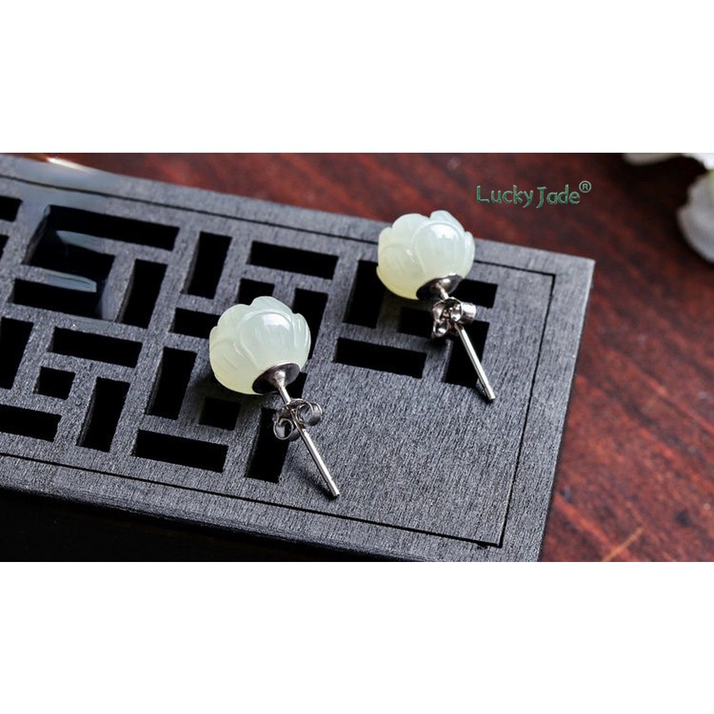 Khuyên Tai Bạc S925 Đính Ngọc Bích Trắng Hình Hoa Sen Đơn Giản Chống Dị Ứng Dễ Phối Đồ