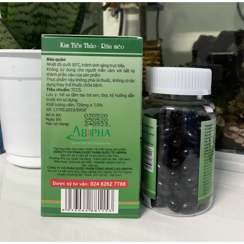 CÔNG THỨC: Cao Kim tiền thảo …………….200 mg Cao Râu mèo …………………..100 mg Tá dược vừa đủ…………………1 viên. (Tinh bột mì, avicel, aerosil, magnesi stearat, đường trắng, talc, gôm arabic, titan dioxyd, HPMC, PEG 6000, nipagin M, PVA, oxyd sắt đỏ, oxyd sắt đen, sáp carnauba, parafin rắn). DẠNG BÀO CHẾ: Viên nén bao đường. QUY CÁCH ĐÓNG GÓI: Hộp 1 chai x 100 viên. CHỈ ĐỊNH: hỗ trợ giảm sỏi đường tiết niệu: sỏi thận, sỏi bàng quang, sỏi niệu quản và sỏi mật. Phối hợp hỗ trợ giảm viêm bể thận, viêm túi mật, viêm gan, vàng da. Dùng trong trường hợp chữa phù thũng, chữa đi tiểu đau, đi tiểu nhiều lần. Người lớn: uống 3 - 4 viên x 3 lần / ngày, uống với nhiều nước. Hoặc theo chỉ dẫn của Thầy thuốc. Đọc kỹ hướng dẫn sử dụng trước khi dùng. Nếu cần thêm thông tin xin hỏi ý kiến bác sĩ. Hạn dùng: 24 tháng kể từ ngày sản xuất. Điều kiện bảo quản: Nơi khô mát, tránh ánh sáng. Tiêu chuẩn: TCCS 🌞 Sẵn sàng đổi trả hoặc hoàn lại tiền cho khách trong 48h kể từ ngày nhận hàng nếu sản phẩm lỗi hoặc hư hỏng trong quá trình vận chuyển ❤ 🎯 Luôn tư vấn tận tâm, nhiệt tình với tâm của người Bán 🎯Đảm bảo tất cả sản phẩm luôn chính hãng 100%, nguồn gốc xuất xứ rõ ràng. LƯU Ý: • Sản phẩm này không phải là thuốc và không có tác dụng thay thế thuốc chữa bệnh! #namsnh #namcosmatic #kimtienthao #kimtienthaoraumeo #abipha #liendoanh.usa NamnhStore kính chào quý khách hàng chúc quý khách hàng. Shop Chúng tôi luôn muốn mang tới cho quý khách những sản phẩm tốt nhất chất lượng dịch vụ tốt nhất. Cảm ơn Quý khách đã tin tưởng ủng hộ shop. Phương châm kinh doanh của shop là "Vui lòng khách đến và hài lòng khách đi" Chúc quý khách "Mạnh khỏe & Thành đạt"