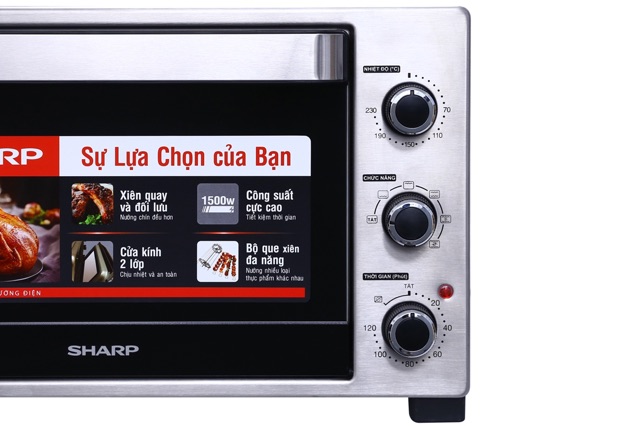 Lò nướng Sharp EO-A323RCSV-ST 32 lít Đặc điểm sản phẩm Loại lò nướng:Lò nướng thùng Dung tích:32 lít Công suất:1500 W Chức năng chính: Làm giòn bánh Nướng thực phẩm Nướng bánh Nướng gà nguyên con 1.5 kg trở xuống Tiện ích: Đèn trong khoang lò Quạt đối lưu Nướng xiên quay Nhiệt độ:100 - 230 độ C Bảng điều khiển:Nút xoay Kích thước:Dài 49.5 cm - Rộng 39.5 cm - Cao 32.5 cm Trọng lượng:8.5 kg Thương hiệu của:Nhật Bản Sản xuất tại:Trung Quốc