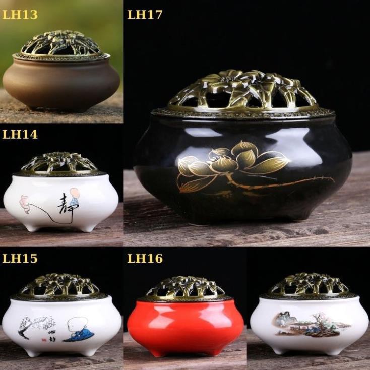 Lư xông trầm lư hương đỉnh đốt nhang gốm sứ nhiều họa tiết tặng 1 nụ trầm