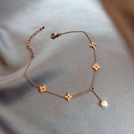 Lắc chân bằng thép titan mạ vàng 18K mặt hình cỏ bốn lá thời trang Hàn Quốc xinh xắn