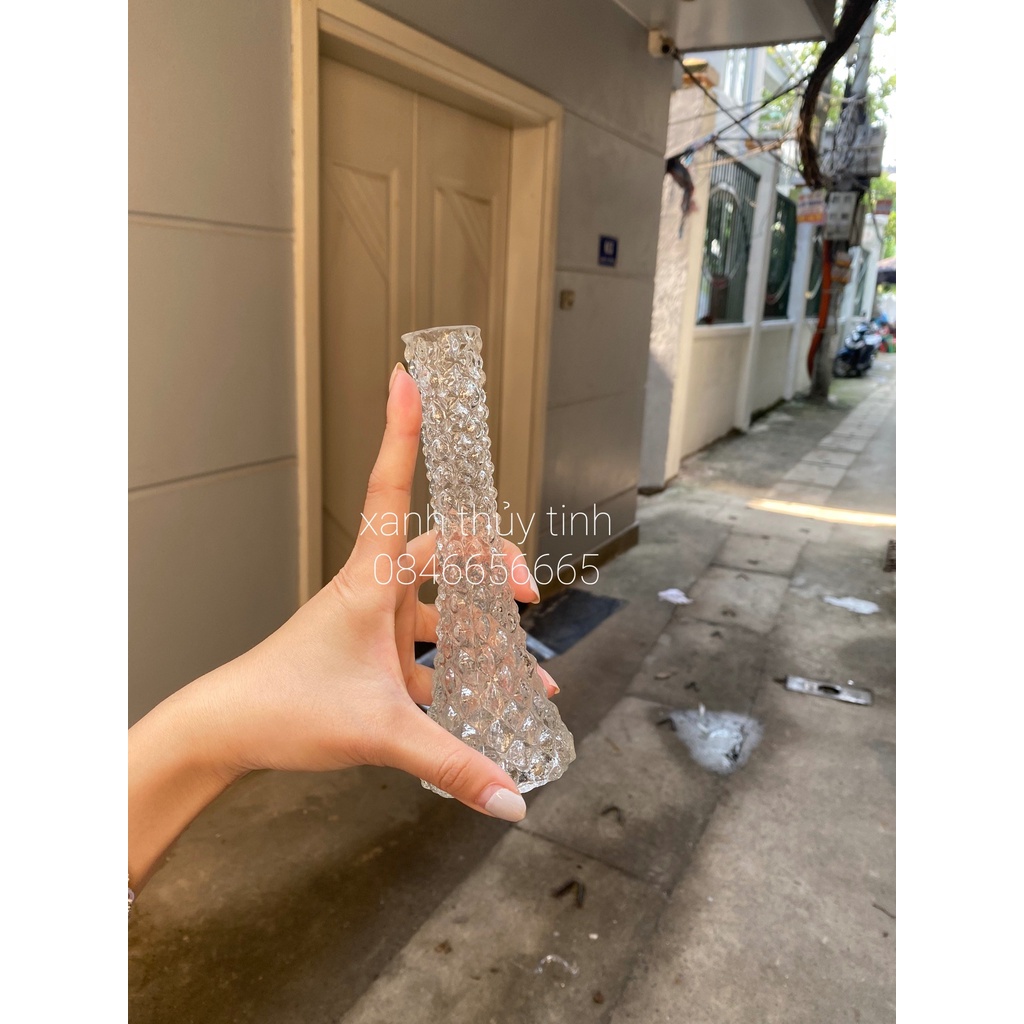 Lọ nhỏ có thể cắm từ 1-3 bông hoa, với chất liệu thủy tinh sần đẹp mắt Họa tiết kim cương trắng, hình tròn dễ cắm các loại hoa, thích hợp với nhiều không gian bày trí như: bàn ăn, bàn trà, phòng nhỏ... Kích thước: cao 16,5cm miệng 2,8cm rộng đáy 6,5cm Thủy tinh việt nam, dày dặn cầm chắc tay Quy định bảo hành và đổi trả sản phẩm: Bảo hành 1 đổi 1 trong mọi trường hợp vỡ, bể do vận chuyển. Điều kiện bảo hành: Quý khách vui lòng QUAY LẠI VIDEO MỞ HÀNG nếu gặp các vấn đề nứt, vỡ, hỏng do vận chuyển hãy nhắn tin qua shopee hoặc gọi cho shop khi để được đưa ra phương án xử lý nhanh nhất, hoàn hàng hoặc bù hàng sớm nhất. XANH THỦY TINH – Chuyên cung cấp các loại trụ thủy tinh cắm hoa, thủy sinh S.Ố L.Ư.Ợ.N.G L.Ớ.N phục vụ hội nghị, sự kiện và trang trí, Decor mọi góc lớn nhỏ cho ngôi nhà của bạn! #Trụhoa #trụcắmhoathủytinh #trụhoathủytinh #trụtrònthủytinh #trụvuôngthủytinh #trụthủytinh #lọhoa #lọhoathủytinh #lọhoavintage #lọhoabắcâu #bắcâu #lọhoadecor #decor #lọhoanhỏ #lọhoatrangtrí #trangtrínhàcửa #decornhàcửa #lọhoađẹp #lọhoaxinhxắn #lọhoadễthương #Truhoa #trucamhoathuytinh #truhoathuytinh #trutronthuytinh #truvuongthuytinh #truthuytinh #lohoa #lohoathuytinh #lohoavintage #lohoabacau #lohoadecor #lohoanho #lohoatrangtri #trangtrinhacua #decornhacua #loahoadep #lohoaxinhxan #lohoadethuong