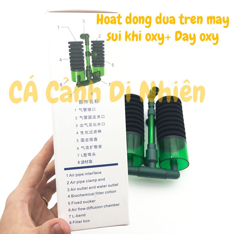 Lọc sủi vi sinh bio bông đôi kèm ngăn lọc QUANVEE QS-200A cho hồ cá có tác dụng chính là hút bụi,các chất bẩn bay lơ lửng trong nước vào trong bể mặt của nó làm cho bể nước trong sạch hơn và là nơi cư trú của các vi sinh vật có lợi. Xuất xứ: Trung Quốc. Trọng lượng sản phẩm: 200 gram. Trọng lượng đóng gói: 400 gram Kích thước hộp: 20 x 15 x 7 cm Đặc điểm: có ngăn đựng vật liệu lọc ( thường sử dụng đá matrix vì tính hiệu quả và nhỏ ). Làm tăng chỗ ở cho vi sinh giúp phân hủy phân cá nhanh hơn. Chỉ số kỹ thuật QUANVEE QS-200A: - Đường kính bông đôi: 6 cm - Cao: 19 kéo dài ống đến 27 cm cm - Rộng: 15 cm - Phù hợp cho bể 120 Lít nước. Thể tích bể: Dài X Rộng X Cao / 1000 + Hoạt động dựa trên nguyên lý nâng lên của khí (Air-lift). Từ máy sủi khí, khí sẽ được đẩy lên mặt nước và kéo theo nước chảy qua mút. ( mua thêm máy sủi khí oxy+ dây oxy để máy hoạt động) + Loại lọc này thích hợp cho hồ không cần dòng chảy mạnh, loại bể cá mini hay các loại bể cá nuôi tép hoặc bảy màu, khi sử dụng trong bể lớn thì phải kèm với các loại lọc khác như lọc tràn hay lọc ngoài. + HƯỚNG DẪN SỬ DỤNG: * Trước khi sử dụng, ngâm lọc bio vào nước hồ trong 5 phút. * Khi vệ sinh lọc bio, vắt nhẹ phần xốp bằng nước trong hồ, không sử dụng nước quá nóng hoặc quá lạnh. * Nên thay mới lọc bio sau mỗi 6 tháng sử dụng để đảm bảo sạch sẽ cũng như sự nitrat hóa của vi sinh