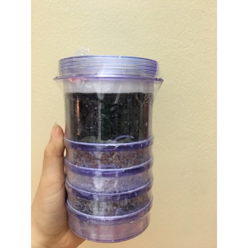 Tầng 1: Than hoạt tính, lọc chất cặn bẩn, Clo, chất độc hại, khử mùi lạ trong nước Tầng 2: đá Zeolite giúp lọc các kim loại nặng, tạo nguồn nước tinh khiết Tầng 3: cát tinh khiết silica giúp xương phát triển tốt hơn, chống lại sự lão hóa sớm và bổ sung khoáng chất có lợi cho sức khỏe Tầng 4: ion – Resin, cát khoáng vô cơ khử các vi khuẩn mang mầm bệnh viêm ruột. Ngoài ra với bộ lọc đá tạo khoáng: trong đá có rất nhiều khoáng chất giúp tăng sức đề kháng cho cơ thể. Tầng 5: Tầng chứa các khoáng vô cơ khử các vi khuẩn mang mầm bệnh, bổ sung khoáng chất có lợi cho sức khoẻ Hiện cửa hàng có 2 loại lõi than đá: - sx tại hàn quốc: ảnh 1 - sx tại vn: ảnh 2