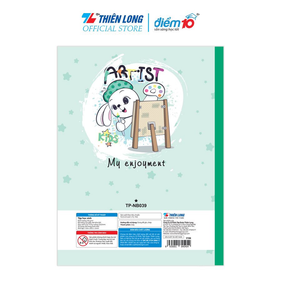 Loại Ôly: 4 ôly vuông (2x2) mm Đặc tính sản phẩm: - Thiết kế bìa đầy màu sắc, hình ảnh sinh động, dễ thương. - Giấy định lượng 60g/m2. - Độ trắng 90-92% ISO. - Số trang: 96 trang cả bìa - Khổ giấy nhỏ: 156 x 205 mm Đối tượng sử dụng: Dành cho tất cả các cấp Đóng gói: 10 quyển/lốc, 10 lốc (100 quyển)/thùng #thienlong #tapvietbutmay #taphocsinh #tapgiare #taphocsinh #tap #vohocsinh #vo