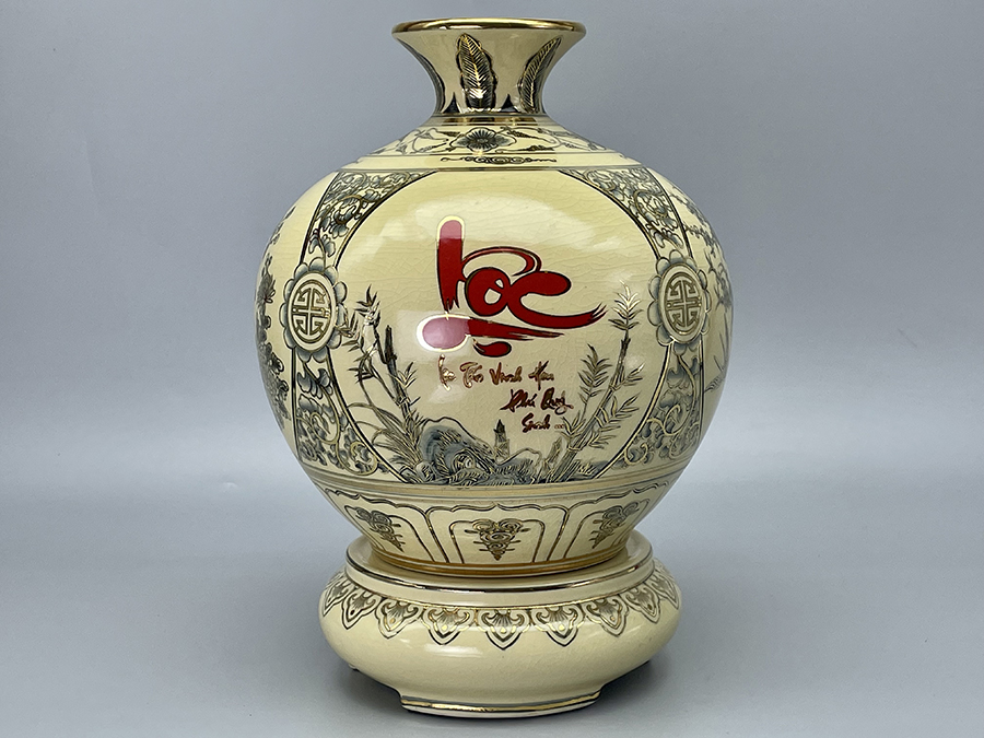 Bình hút tài lộc phong thủy họa tiết tứ cảnh vẽ vàng, gốm sứ Bát Tràng cao cấp