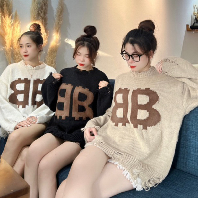 Áo khoác cardigan len màu be kem phối viền kẻ thêu chữ form rộng Quảng Châu 627