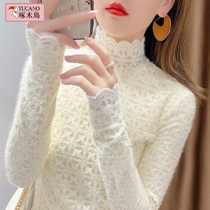 Áo len nữ cao cổ phối ren áo len cổ lọ nữ tính phong cách mùa thu đông áo giữ nhiệt